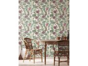 Bílá vliesová tapeta na zeď, květiny a motýli v odstínech zelené, vínové, modré a béžové.