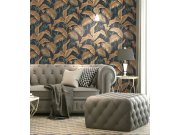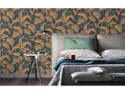 Vliesová, tmavě modrá tapeta s jemně strukturovanými metalickými listy v odstínech bronzové, hladké listy v metalické zelené.