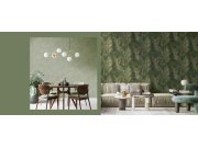 Hrubě strukturovaná vliesová tapeta na zeď, motivy listů v odstínech zelené, hnědé a černé.