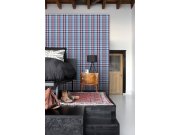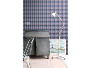 Vliesová tapeta na zeď, vzor káro v odstínech modré, bílé a čevené.
