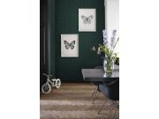 Vliesová zelená tapeta na zeď, motiv letících ptáků, jeřábů, textilní struktura.