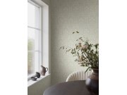 Luxusní vliesová tapeta s vinylovým povrchem s neobvyklým vzorem - plastické vlnky a lístky v šedo-béžovém odstínu se zlatým a zeleným vzorem větviček s květinami a lístky.