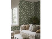 Jemně plastická šedobéžová vliesová tapeta s vinylovým povrchem, motivy květin s nádechem do zelena, látková textura.