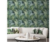 Zelená a tyrkysová hrubě strukturovaná tapeta s motivy listů palem.