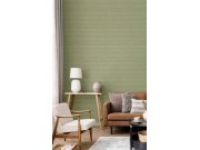 Luxusní vliesová tapeta s vinylovým povrchem, textura evokuje proplétanou rohož z přírodního materiálu, odstíny zelené a béžové. Foto interiéru je pouze ilustrační - odlišné barvy. Co vás zaujme: kvalita zpracování, vysoká odolnost. Design: luxusní, příro
