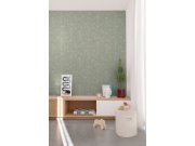 Zelená dětská vliesová tapeta, ornamentální motiv květin a lesních zvířátek. Tapeta má látkovou texturu, je vhodná do dětského pokojíčku.