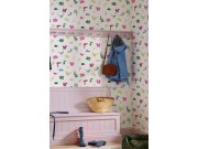 Krémová vliesová tapeta na zeď, barevné motivy zvířat a rostlin.