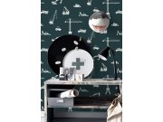 Vliesová tapeta pro kluky - auta, jeřáby, vrtulníky, tmavě modrý podklad, bílý vzor.