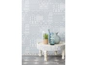 Etno vzor v šedo-modré a bílé barvě na vliesové tapetě.
