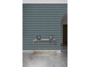 Vliesová tapeta s výraznou texturou a geometrickým vzorem v odstínech modré, bronzové žíhání.