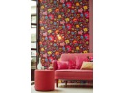 Pestrý květinový vzor na šedo-hnědé vliesové tapetě.