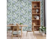 Modrá vliesová tapeta s vinylovým povrchem, květinový vzor a ptáčci v odstínech zelené a modré.