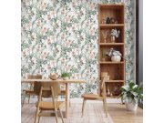 Bílá vliesová tapeta s vinylovým povrchem, květinový vzor v odstínech zelené a růžové.