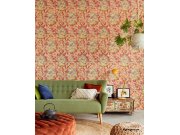 Tapeta imitujícím látkovou strukturu. Ornamentální vzory v zelených, červených a vínových odstínech na krémovém podkladu.