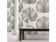 Vliesová tapeta s motivem velkých šedo zelených listů na bílém perlovém strukturovaném podkladu.