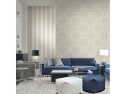 Vliesová tapeta s geometrickým vzorem. Podklad šedo-krémová, vzor šedo-béžová, metalické stříbrné detaily.