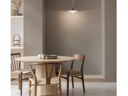 Šedá vliesová tapeta na zeď se stříbrným leskem a geometrickým vzorem v hnědé barvě.