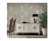 Luxusní květinová tapeta - podklad vlies, povrch plastický vinyl. Velký květinový vzor, podklad plastický vzorek. Barvy na tapetě - podklad hnědá s metalickým leskem a drobnými třpytkami, vzor odstíny šedo-modré, stříbrné a zlaté.