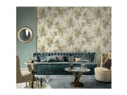 Luxusní květinová tapeta - podklad vlies, povrch plastický vinyl. Velký květinový vzor, podklad plastický vzorek. Barvy na tapetě - podklad šedý s drobnými zlatými třpytkami, vzor odstíny modré, růžové, zelené, béžové.