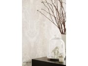 Zámecký ornamentální vzor v šedé a bílé barvě na vliesové tapetě.