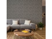 Šedá vliesová tapeta na zeď, motiv malby rozkvetlých větviček, tapeta má látkovou texturu.