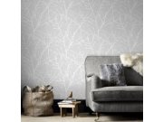 Vliesová tapeta, imitace šedé látky, metalické perlové větvičky.