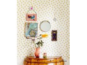 Puntík vnese do vašeho interieru nový rozměr a originalitu. Okrové jemně plastické puntíky se zlatými třpytkami na bílém podkladu.