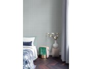 Jemně plastická textura, žíhání a struktury vytváří nepravidelný obdélníkový vzor. Odstíny pololesklé šedé, stříbrné, tyrkysové a béžové, metalické odlesky. Vliesová tapeta s vinylovým povrchem.