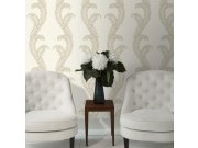 Damaškový vzor v perlově-krémových odstínech na vinylové tapetě s jemnou látkovu strukturou.