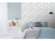 2 KS SKLADEM. Vliesová tapeta s designem listů v odstínech šedé, modré, tyrkysové a zelené, podklad šedý žíhaný, s jemnou textilní strukturou.