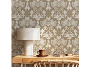 Luxusní, plastická, vliesová tapeta s vinylovým povrchem, podklad terakotově hnědá, šedo-béžový ornamentální zámecký vzor s jemným zlatavým pololeskem. Co vás zaujme: vysoká odolnost, propracované detaily. Design: zámecký, luxusní. Úroveň tapetování: pro