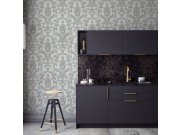 Luxusní šedo-stříbrná vliesová tapeta s vinylovým povrchem, stříbrný zámecký vzor. Foto interiéru je pouze ilustrační - odlišné barvy.
