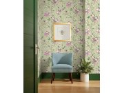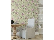 Zelená vliesová tapeta na zeď, květiny v odstínech růžové, zelené a hnědé.