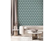 Zelená vliesová tapeta s vinylovým povrchem, kovově lesklé obrysy, bílé detaily, vzor ve stylu Art Deco.