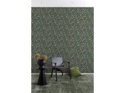 Zelená vliesová tapeta na zeď, květiny v odstínech zelené, okrové a růžové. Tapeta má jemnou krupičkovou texturu.