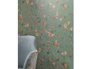 Hladká zelená vliesová tapeta na zeď, ptáčci a rozkvetlé větvičky, místy jemné pololesklé detaily.