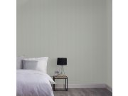 Jemně plastická, pruhovaná, zelená a šedá, vliesová tapeta s vinylovým povrchem, místy metalické stříbrné odlesky.