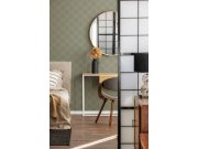 Jemně plastická zeleno-zlatá vliesová tapeta se strukturou rohože.