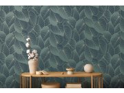 Zelená vliesová tapeta s vinylovým povrchem, motivy listů se zlatými obrysy. Foto interiéru je pouze ilustrační - odlišné barvy.