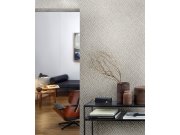 Béžová vliesová tapeta na zeď s nádechem khaki s jemným geometrickým metalickým vzorem.