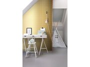 Šedý geometrický vzor na hladké zlaté pololesklé vliesové tapetě na zeď.